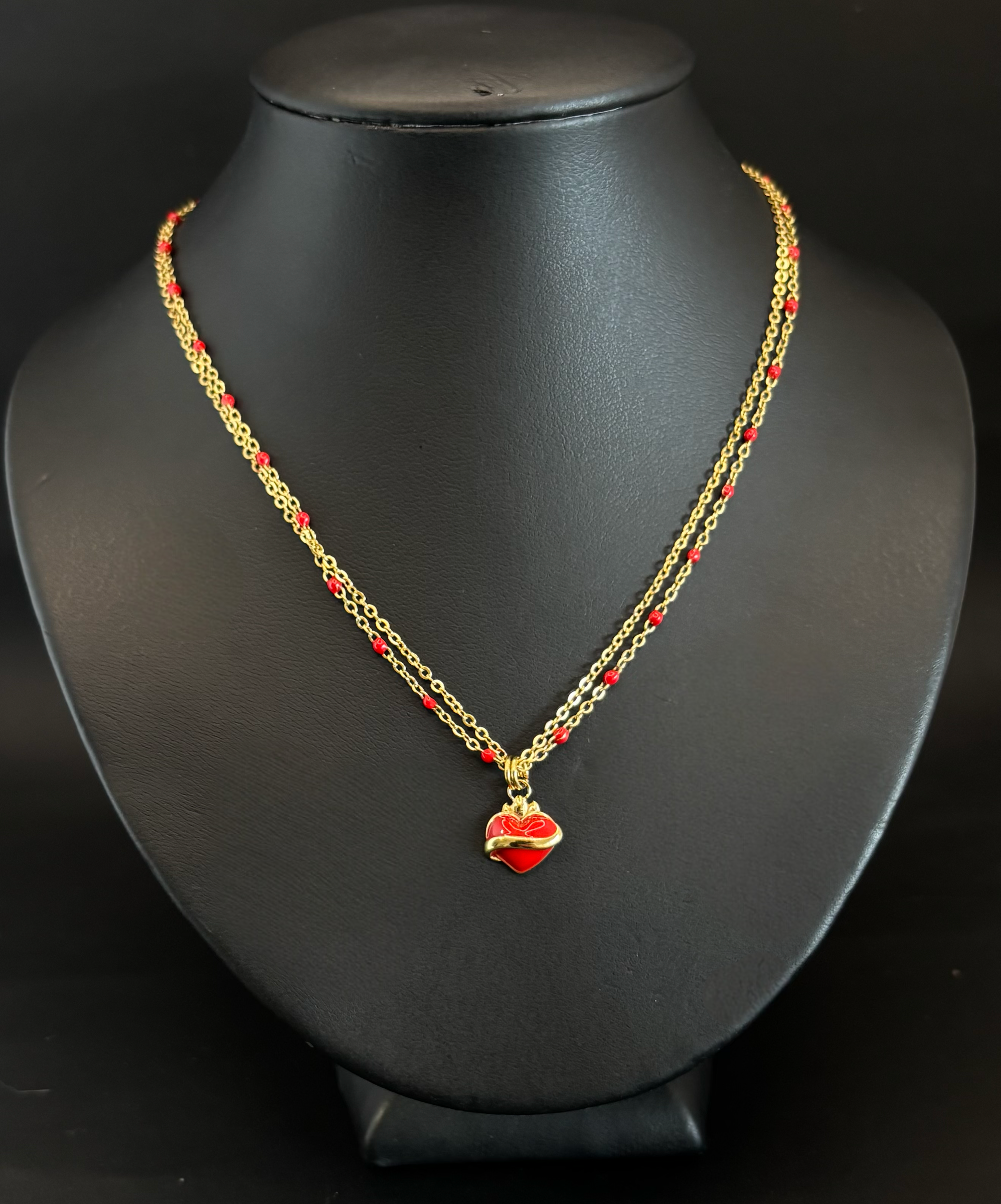 Collier 2 rangs fins chaine et cœur Sacré en acier émaillé.