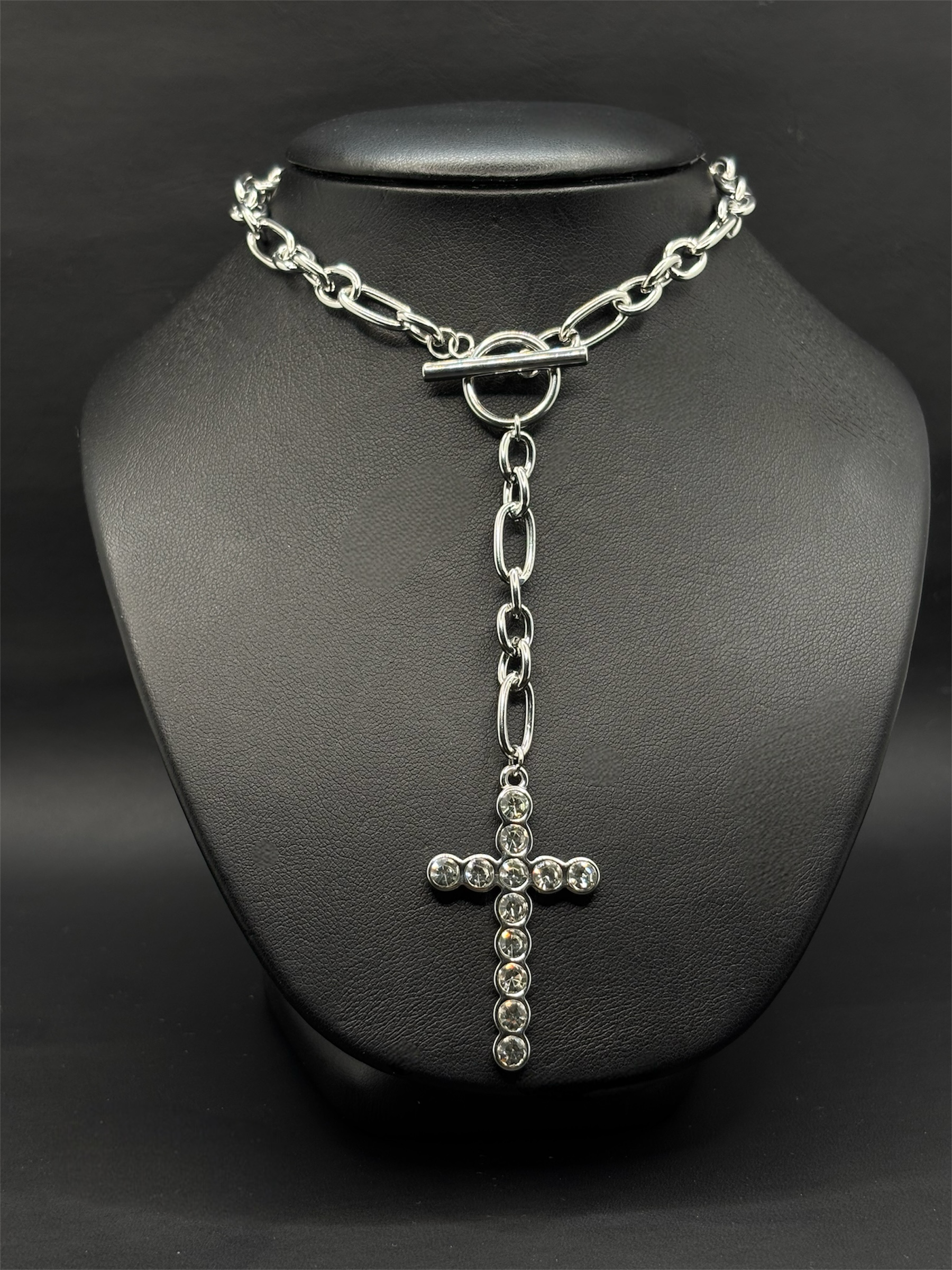- Collier chaine acier et croix strassée en acier et zirconium.Chaines 44 cm avec chaine pendante de 5 cm