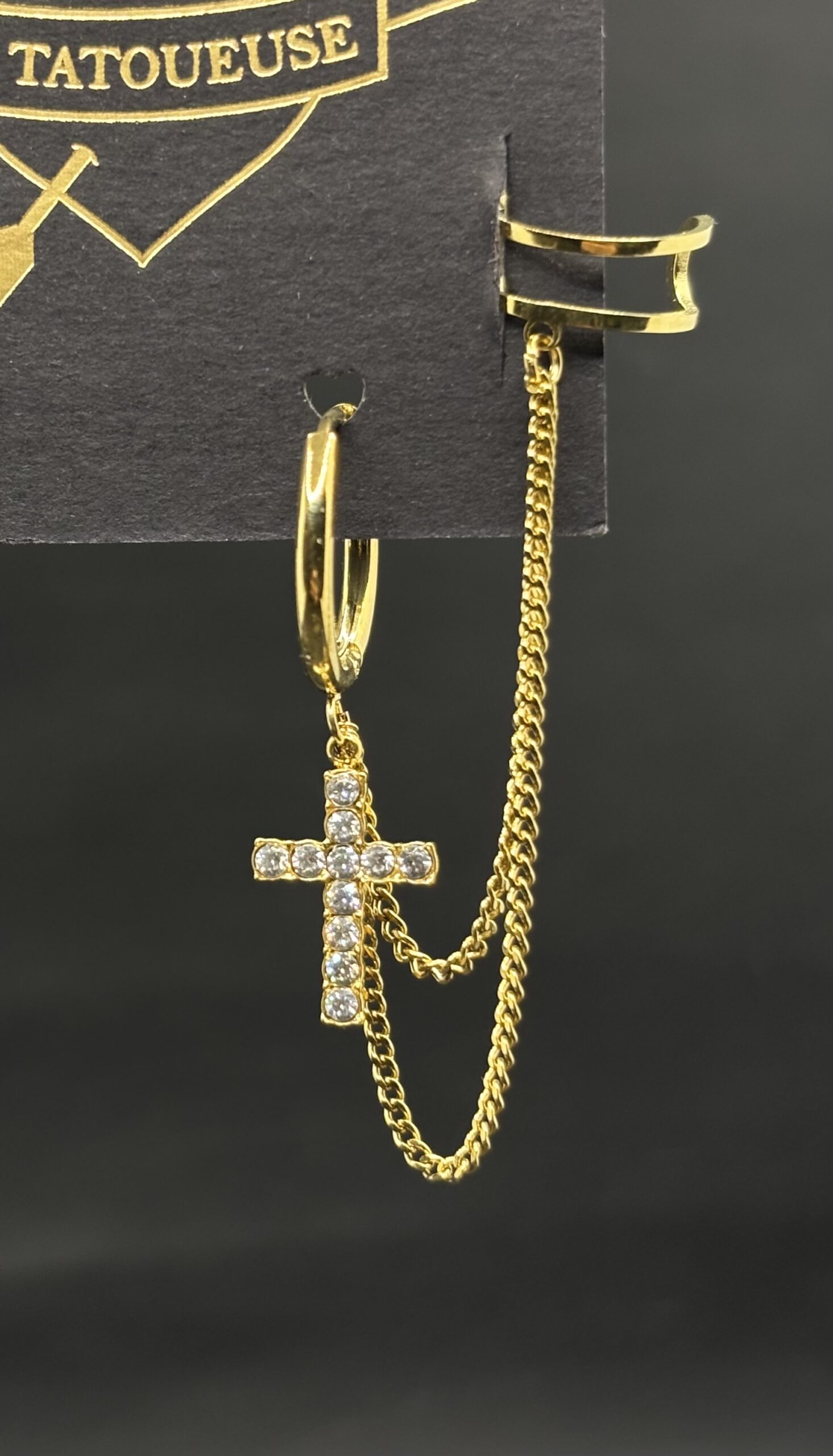 Créole avec earcuff double chaine et croix strassée en acier et zirconium.