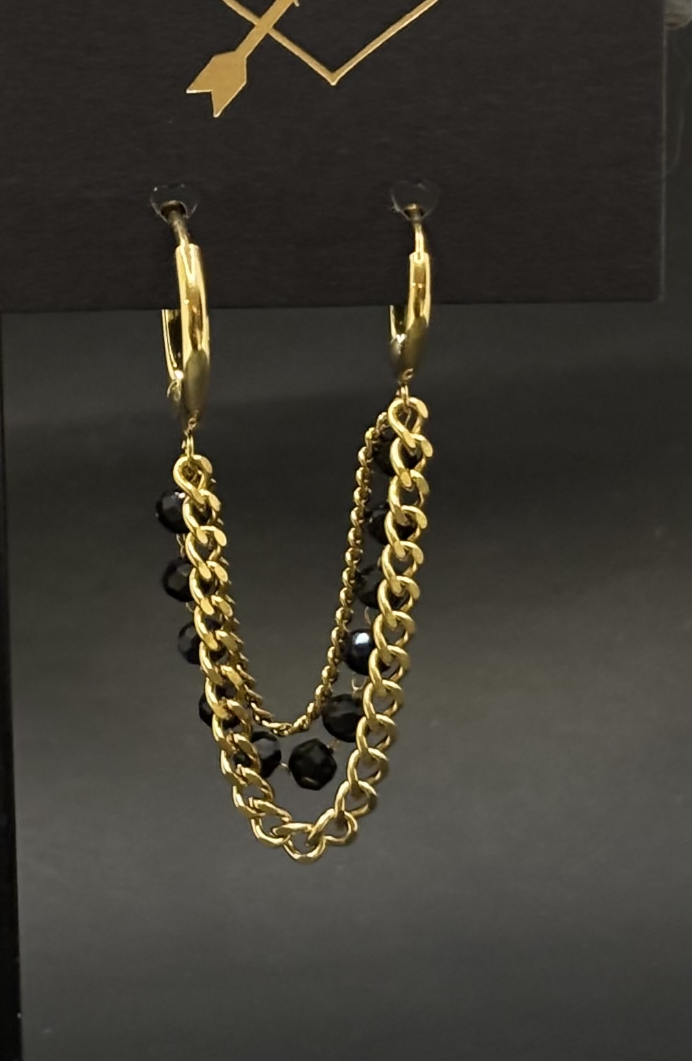 Monoboucle avec triple chaines dorées ou argentées et perles de verre noires facettées .